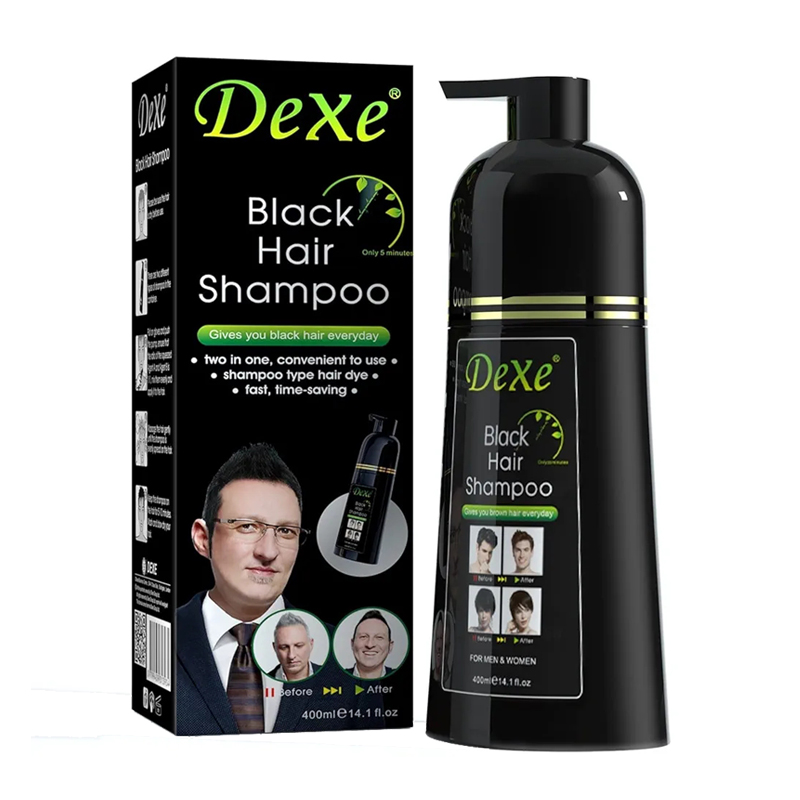 Dexe Black Hair Shampoo restores natural black hair color while cleansing and nourishing hair for a fresh, youthful look.